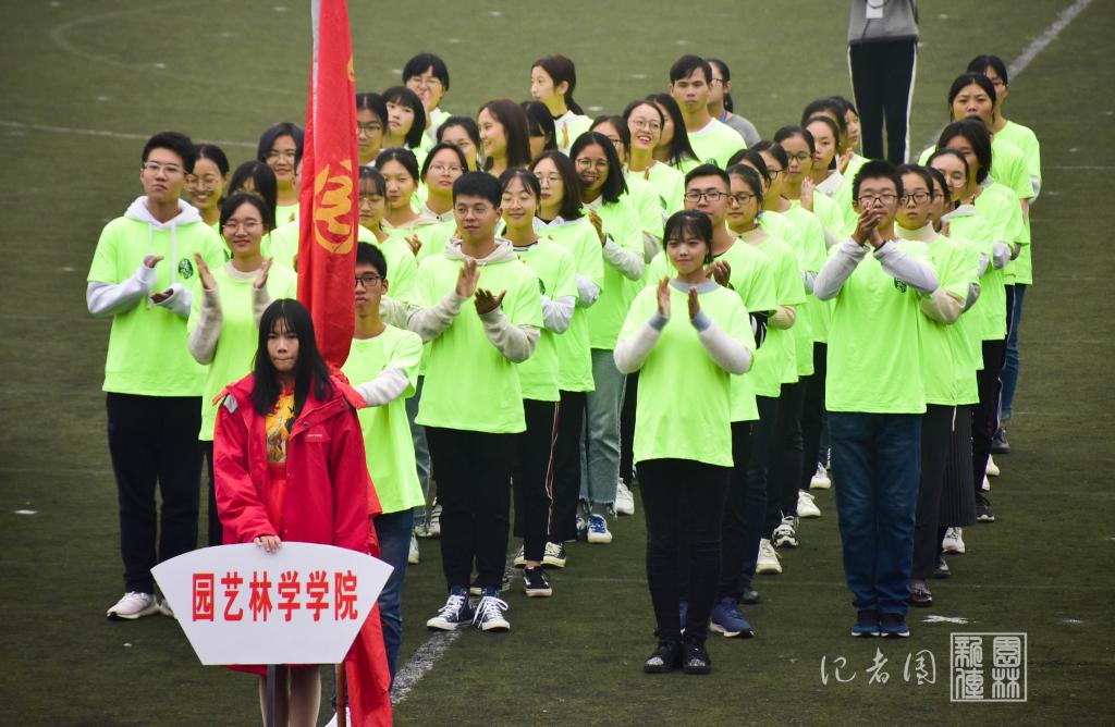 身着红色大衣的引导员高举院牌在绿茵场上站定,身着荧光绿色统一服装的院仪仗队迈着整齐的步伐紧随其后。伴随着富有节奏感与韵律感的背景音乐,本届运动会闭幕式开始。