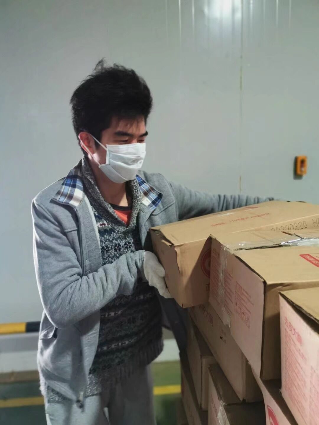 一箱冷冻肉25kg,而在一辆运输车上这样的冷冻肉大约有1000箱。为了防止生鲜食品变质,汪泽辰要和他的同事们需要在最短时间内完成这每天25吨的卸货。全国各地运来武汉的物资都集中在配送中心,这些货物都被如汪泽辰这样的志愿者或是工作人员分配到不同的超市,解决武汉市民的生活问题。卸货是件相当消耗体力的工作,刚刚进入春天的武汉气温依然很低,这些工作人员们却在卸货、搬抬的过程中累出了满身的汗。货物量大的时候,汪泽辰甚至忙到没有时间吃饭,只能抽空吃两口饼干继续开始自己的工作。但问及是否觉得辛苦时,他只是笑着说:“苦吗?其实还好,已经习惯了,而且我觉得很值得很开心。”