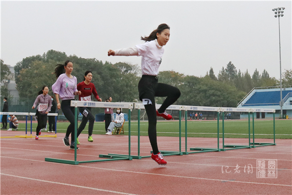清瘦而富有爆发力的身影以蹲踞式伏在起跑线前,伺机待发,凝神静待发令枪声。白烟显露的刹那,身着白色院服的孙晓妍同学大步前迈,轻盈敏捷地越过一个又一个跨栏,在不知不觉中拉开了与旁边选手的距离。最终她凭借自己科学有效的步伐频率以巨大优势获得第一名的优异成绩。