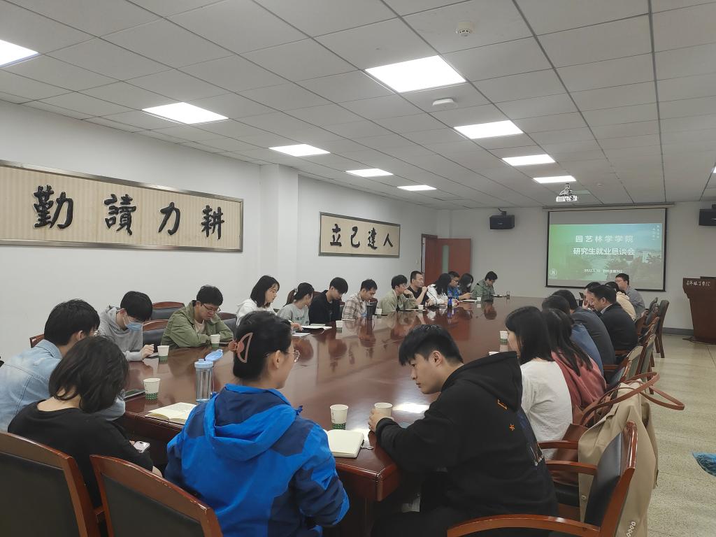 5.11日上午9点半,园林院研究生就业恳谈会在园林北楼302举行,院党委书记张宏荣、院长程运江、副书记蔡江、罗正荣教授、刘永忠教授、柴利军教授、辅导员肖晗及20余名2022届毕业研究生参加了会议。