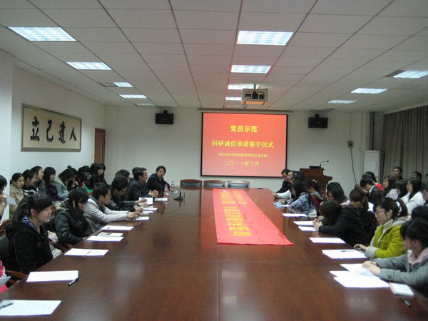“弘扬科学精神,倡导诚信科研,净化学术环境,每位党员应该坚决抵制‘学术浮躁’、‘学术造假’、‘学术腐败’等现象,我郑重承诺……”3月28日晚,学院202会议室响起庄严的宣誓声音,学院院果树系研究生党员郑重在“科研诚信,党员示范”承诺书上签字。院党委副书记邓俊涛、副院长叶志彪教授、果树系教工党支部书记伊华林教授及研究生辅导员王鹏宇老师参加此次活动。
