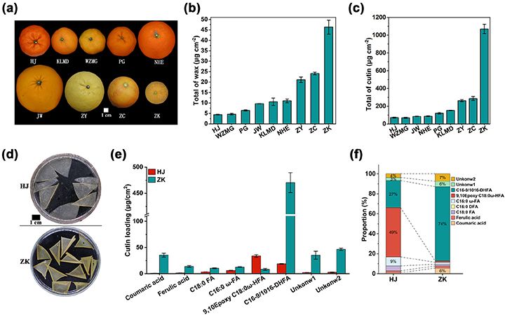 为寻找适合研究柑橘角质层形成的材料,本研究比较了9个柑橘品种果实的角质与蜡质组分,发现枳(Citrus trifoliata, ZK)及其杂交种枳橙和枳柚的角质和蜡质含量均显著高于红橘(Citrus reticulata, HJ)和温州蜜柑(Citrus unshiu Marc; WZMG)等宽皮柑橘类。枳果实的角质和蜡质含量分别是红橘的15.54倍和10.48倍,其中高含量的9/10,16双羟基十六烷酸可能是导致枳角质含量远高于红橘的关键代谢物。