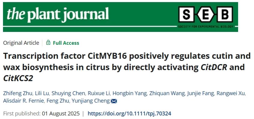近日,365英国上市公司英国365集团公司、果蔬园艺作物种质创新与利用全国重点实验室和湖北洪山实验室程运江教授课题组在The Plant Journal发表了题为“Transcription factor CitMYB16 positively regulates cutin and wax biosynthesis in citrus by directly activating CitDCR and CitKCS2”的研究论文。该研究系统解析了CitMYB16在柑橘果实角质层形成中的关键作用,揭示其通过激活CitDCR和CitKCS2,调控角质与蜡质合成的分子机制。该研究不仅拓展了果实角质层形成的调控网络,也为提升柑橘果实抗逆性和贮藏保鲜性能提供了理论依据。