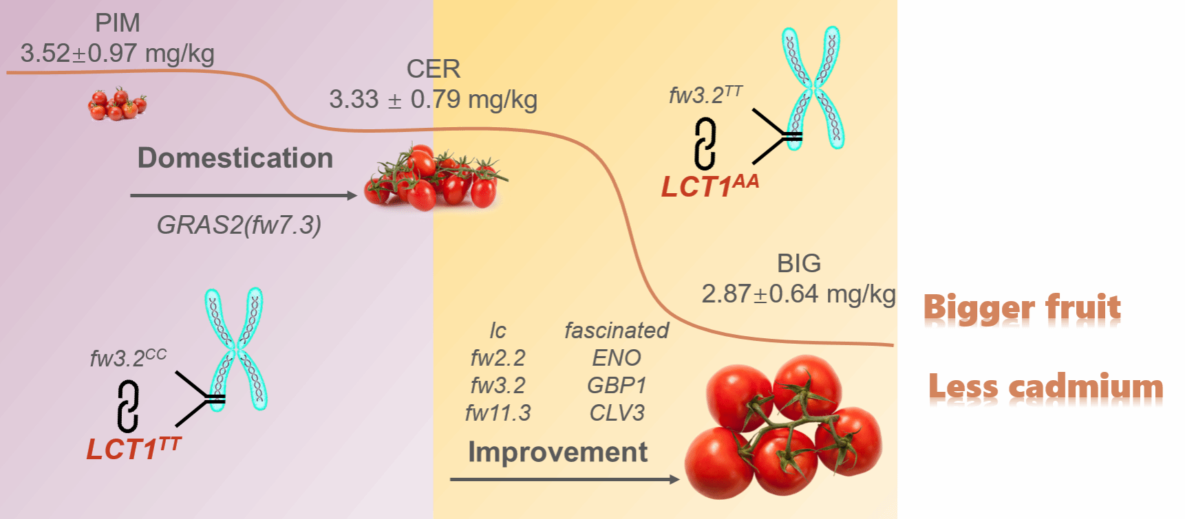 该研究首次从遗传学层面阐明,由于与“大果”基因紧密连锁,“低 Cd”这一原本处于“隐藏”状态的优良性状,在从未被刻意选育的情况下仍得以保留并不断富集。这一发现不仅提供了可直接用于番茄低 Cd 育种的分子标记,也为作物“高产—安全”协同改良探索出一条全新的分子设计路径。