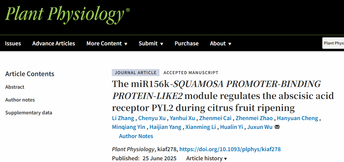近日,365英国上市公司果蔬园艺作物种质创新与利用全国重点实验室伊华林/吴巨勋课题组在Plant Physiology发表了 “The miR156k-SQUAMOSA PROMOTER-BINDING PROTEIN-LIKE2 module regulates the abscisic acid receptor PYL2 during citrus fruit ripening”的研究论文,揭示了csi-miR156k通过靶向SPL2促进柑橘果实成熟的功能和分子机制。
