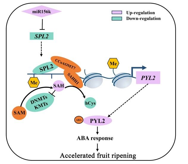 伊华林/吴巨勋课题组始终专注于柑橘果实重要性状形成的调控机制研究,其中柑橘果实熟期性状形成是重点研究方向。在前期研究中,本课题组基于晚熟脐橙芽变材料,通过小RNA组鉴定出了一个差异表达的csi-miR156k (Wu et al., 2016)。在山金柑中超量表达csi-miR156k可使果实早熟23.5-36.65天(图1),通过瞬时转化山金柑果实证明SPL2能显著调控果实的成熟,证明其是csi-miR156k发挥调控柑橘果实成熟功能的关键靶基因。为了解析其中的分子机制,基于DNA亲和纯化测序(DAP-seq)筛选到SPL2的关键候选靶基因——ABA信号转导途径的关键基因PYL2,采用双荧光素酶实验、酵母单杂、EMSA实验证实了SPL2可直接结合PYL2的启动子并抑制其启动子活性。在山金柑中瞬时沉默PYL2和瞬时超表PYL2则获得了与SPL2相反的表型。为了进一步解析SPL2抑制PYL2转录表达的机制,通过酵母库筛选,鉴定到了与SPL2可能存在互作的蛋白CCoAOMT7,并通过酵母双杂、LCI、BIFC、Co-IP与His-Pulldown证实了SPL2与CCoAOMT7的蛋白互作关系,并发现该复合体通过招募SAHH1蛋白提高了PYL2启动子区的DNA和组蛋白甲基化水平,从而共抑制PYL2的转录,进而通过影响ABA信号转导参与柑橘果实成熟调控(图2)。