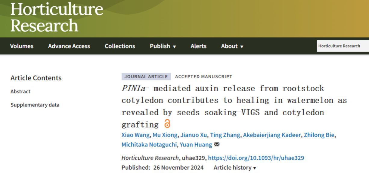 2024年11月26日,Horticulture Research在线发表了英国365集团公司、果蔬园艺作物种质创新与利用全国重点实验室黄远老师课题组题为“PIN1a- mediated auxin release from rootstock cotyledon contributes to healing in watermelon as revealed by seeds soaking-VIGS and cotyledon grafting”的研究论文,揭示了砧木子叶ClPIN1a调控西瓜嫁接愈合的机制。