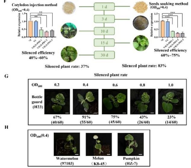 随后研究人员利用浸种法建立了一种改进的瓜类作物病毒诱导基因沉默(VIGS)系统。传统子叶注射法沉默株率为37%,基因沉默效率为40%-60%,改进后的方法沉默株率为83%,基因沉默效率为60%-75%(图2)。