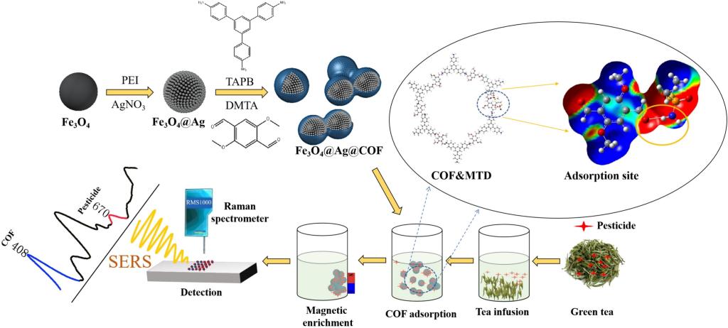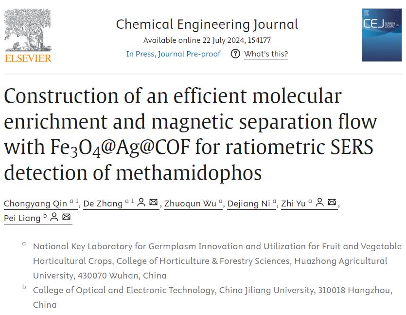 近日,英国365集团公司/果蔬园艺作物种质创新与利用全国重点实验室倪德江教授团队张德副研究员和余志副教授在国际顶级学术期刊Chemical Engineering Journal上在线发表了题为“Construction of an efficient molecular enrichment and magnetic separation flow with Fe3O4@Ag@COF for ratiometric SERS detection of methamidophos”的研究论文。本研究提出了一种可以在茶叶复杂基质中高效磁性富集、快速检测甲胺磷农药残留的有效策略,为保障茶叶质量安全奠定了研究基础。