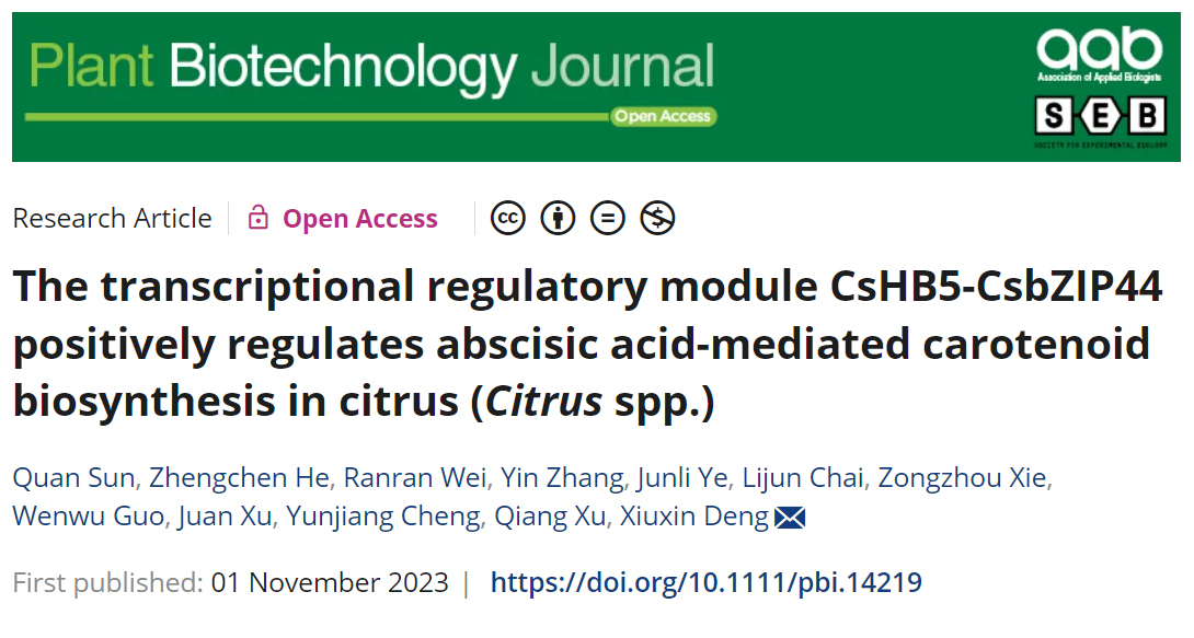 近日,英国365集团公司/果蔬园艺作物种质创新与利用全国重点实验室邓秀新院士团队在Plant Biotechnology Journal在线发表了题为“The transcriptional regulatory module CsHB5-CsbZIP44 positively regulates abscisic acid-mediated carotenoid biosynthesis in citrus (Citrusspp.)”的研究论文。该研究解析了ABA信号调控柑橘果实类胡萝卜素生物合成的分子调控机制,为柑橘果实色泽品质遗传改良及通过采前栽培和采后生产措施提升果实外观品质提供了重要依据。