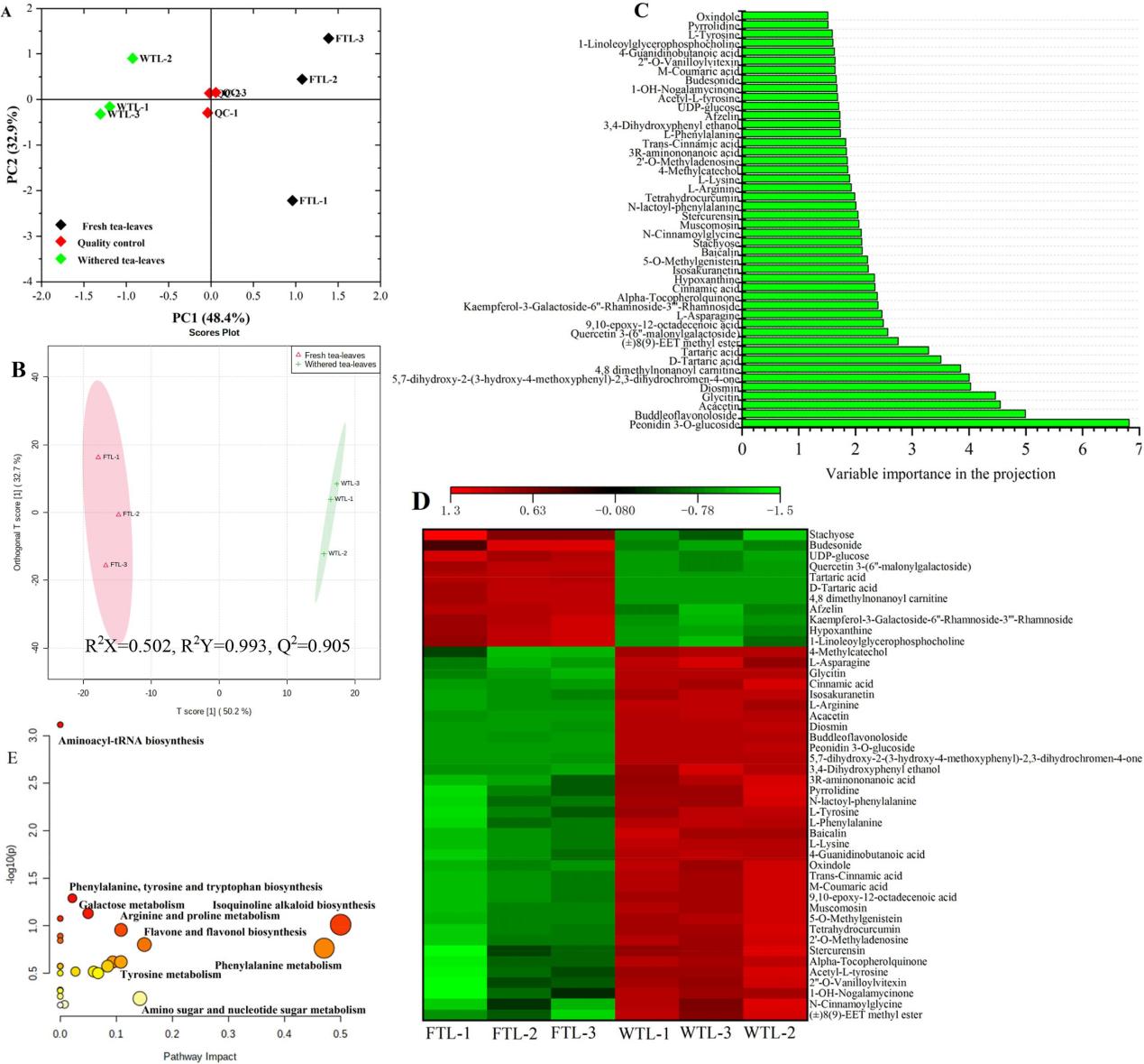 图2萎凋过程对茶叶中非挥发性代谢物及相关途径的影响