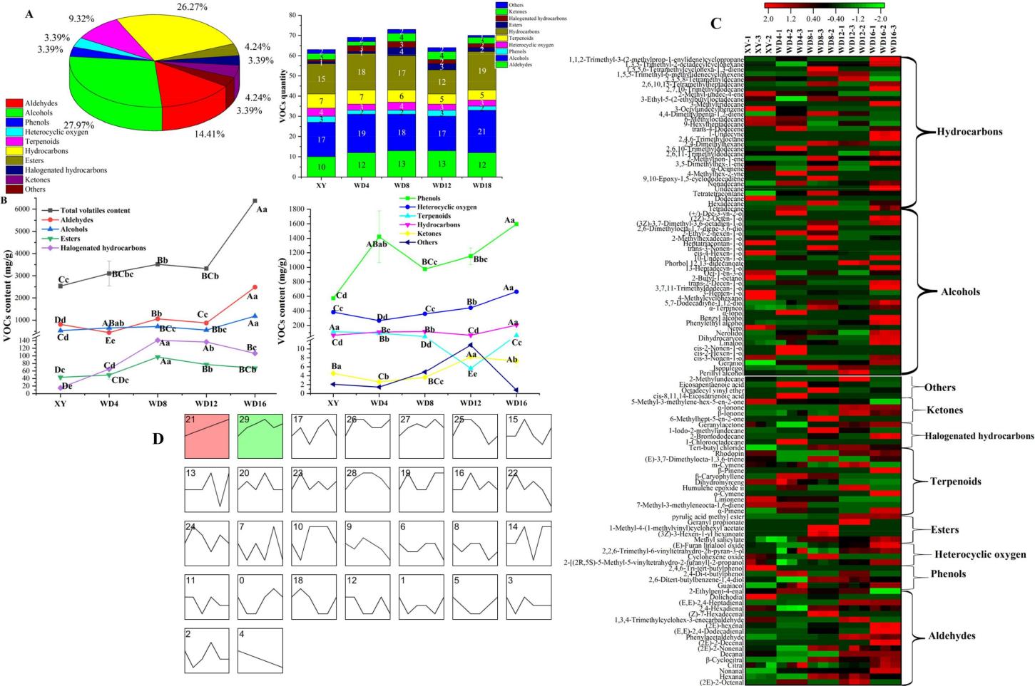 图1 挥发性有机物的分类分布及其在萎凋过程中的动态变化