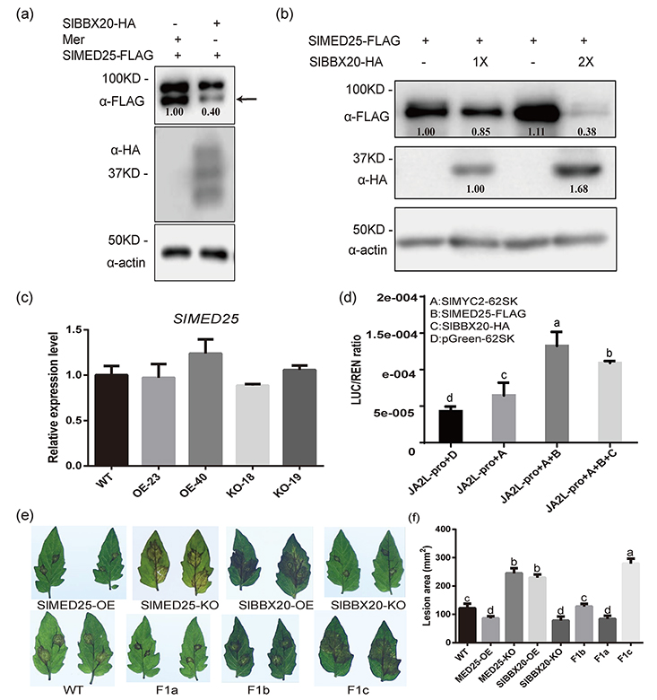 图2 SlBBX20通过抑制SlMED25蛋白的积累调控JA信号影响对灰霉病的抗性