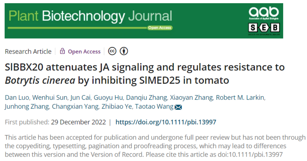 近日,365英国上市公司番茄团队王涛涛教授课题组在国际权威学术期刊《Plant Biotechnology Journal》发表了题为《SlBBX20 attenuates JA signaling and regulates resistance toBotrytis cinereaby inhibiting SlMED25 in tomato》的研究论文。茉莉酸(JA)在调节植物生长和防御反应中发挥着重要作用,研究发现SlBBX20可调控JA的各种响应反应,是一个新的JA响应的负调控因子,JA与灰霉病的抗性密切相关,当过量表达SlBBX20时,番茄对茉莉酸的响应被抑制,导致番茄对灰霉病的抗性减弱。相反,当敲除SlBBX20基因后,JA响应增强,同时显著增强了番茄对灰霉病的抗性。