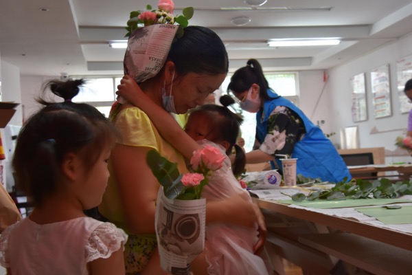 在科普课堂讲解完毕后,实践团成员将花材与包装纸分发到小朋友及家长手中。首先由小朋友们发挥奇思妙想,自己动手制作花束,在遇到困难时向实践团求助,成员们及时予以回应。家长们也参与其中,协助小朋友们完成花束作品,活动现场其乐融融。