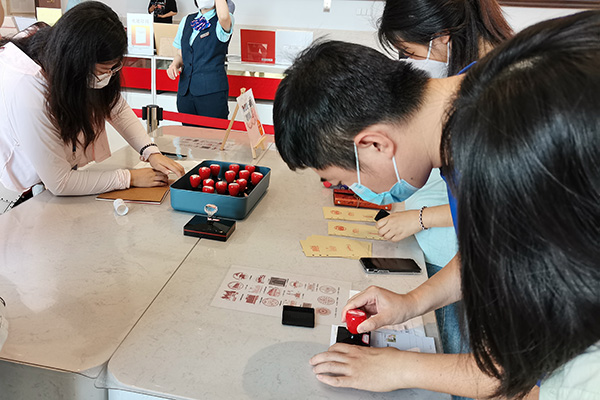纪念品销售策略优秀。实践团成员最后前往中国共产党历史展览馆主题邮局处进行免费的红色主题印章盖章收集,共收集到17枚。免费的盖章大大增加了游客购买纪念品或明信片的兴趣与意愿,“这已经是我这个假期来这里(集章)的第三次了,我已经买过好多这个‘红色印记’的本子了。”一名游客笑道。另一名游客也分享道:“这个印章好看,我要多买几个明信片盖这个印有立柱的章。”