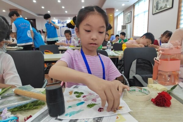 【核心提示】为丰富社区儿童暑期生活,助力第二课堂建设,7月7日上午十点,我院张瑜服务队赴武汉市硚口区学堂社区举办以“非遗植拓,敲染自然”为主题的植物拓印体验活动。