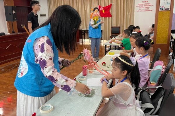 上午十一点半,活动顺利结束,小朋友们积极展示作品并合影留念。志愿者何欣欣谈到:“孩子们十分喜欢接触鲜花、敲打拓印的过程,将传统的非遗拓印带进课堂,不仅是对孩子们假期成长的促进,更是对非遗文化的弘扬与传承。之后的科普实践课程里,张瑜服务队会为社区儿童带来更多自然与文化相交融的生动科普与有趣实践。”