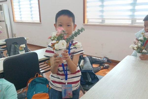 上午十一点半,此次花艺科普实践活动圆满结束,小朋友们纷纷与插花作品合影留念。志愿者何欣欣总结道:“小朋友们的插花作品不拘一格,极具创造力。而我们活动的意义就在于为孩子们提供发现美、创造美的平台,带领他们感悟、体验自然与创造的魅力。”