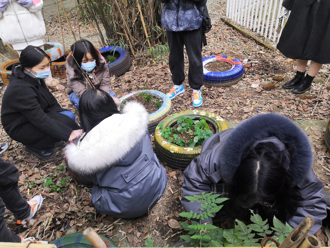党员志愿者们早早到达了活动地点。本次下沉活动的内容为在华农西社区党员群众服务中心门前的微型景观园种植萝卜。同学们提前准备了小土铲和水壶,大家兵分两路,一边在山上挖土,一边在原地寻找播种土。一位路过的退休老教师告诉同学们,在附近的一条沟里有很肥沃的土壤,是落叶堆积的沤肥,还笑着说,大学生们还是要多向老农民学习学习。另一边在山上挖土的同学们还找到了许多蕨类植物和枇杷苗等植物,打算运用园林人的专业知识好好把园子布置一下。