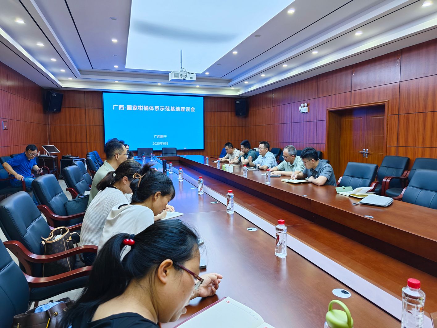 专家组与广西水果技术指导站站长王举兵、副站长郑吉祥,广西农科院园艺所副所长赵洪涛及团队成员就广西-国家柑橘体系示范基地建设进行了现场考察和座谈交流。王举兵站长对程运江教授一行的到来表示热烈欢迎,并表达希望国家柑橘体系专家对示范基地建设提供技术支持,在广西水果技术指导站合作共同打造国家级产业技术展示及技术培训中心。重点就明年基地建设的重点任务、实施方案和经费预算等具体事宜进行了详细研讨和充分交流。程运江教授、刘永忠教授、解凯东副教授分别就基地种质资源库、栽培展示园、新品种展示园的建设方案提出了建议。程运江教授强调,本基地的定位要立足广西,面向东盟,打造成国家级水平的科技成果集中展示和人才培养基地,要以柑橘产业数字化转型为契机,为广西柑橘产业转型升级做好示范。该基地的建设对于国家、广西水果产业发展具有重要意义。