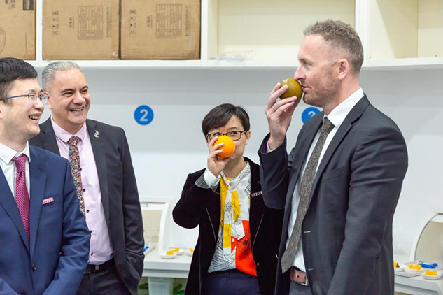在感官评价实验室,同学们正在进行一场宗橙和伦晚脐橙的感官评价,Clinton Watson参赞和Darryl Ryder在对两种品种进行了品评之后,分别做出了自己的品评结果,对实验室柑橘新品种以及感官品评学科有了深入的了解并产生很大兴趣。