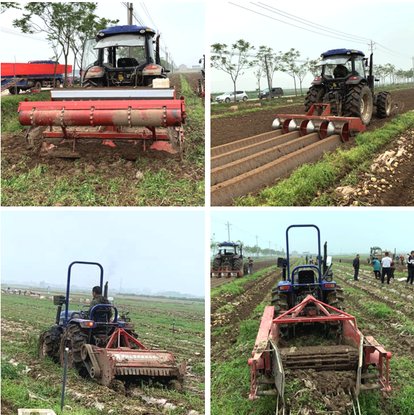 机械化现场示范观摩(上左,旋耕机;上右,起垄机;下左,杀秧机;下右,收获机)