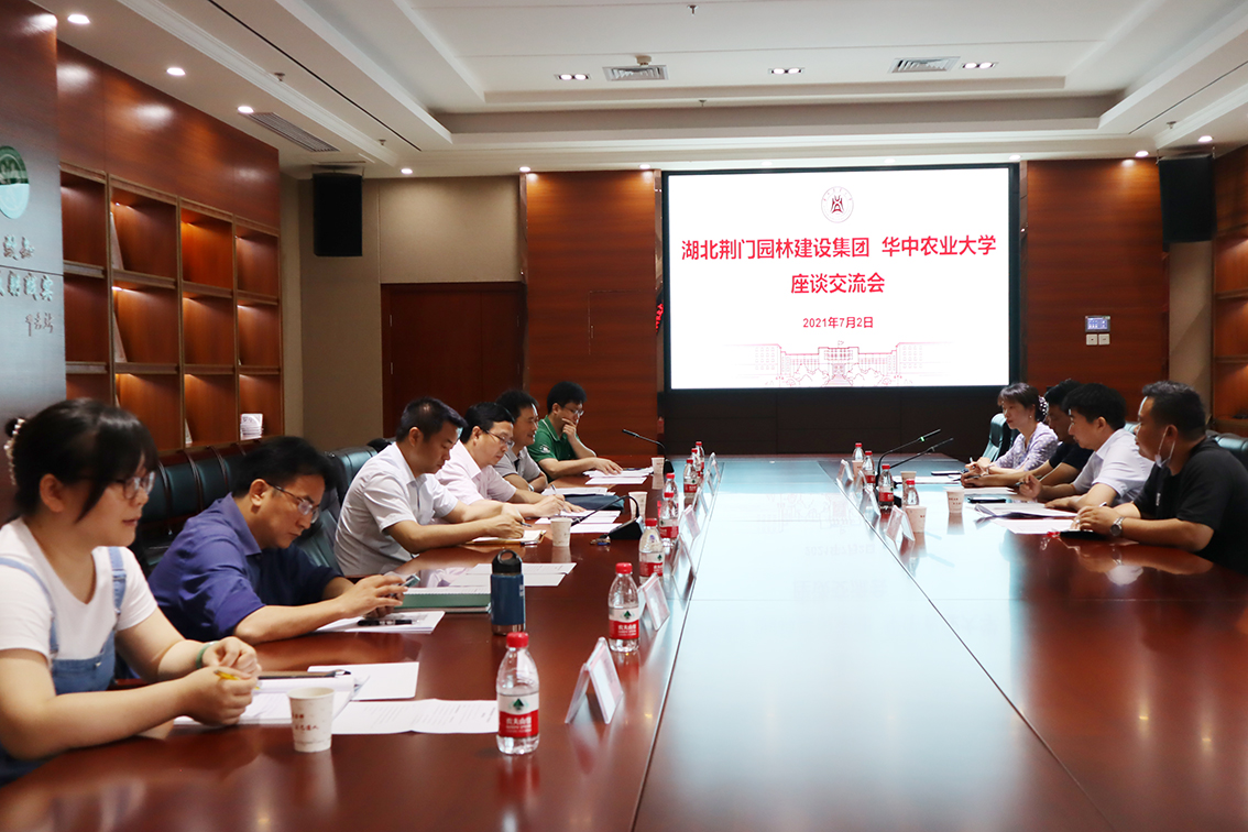 2021年7月2日下午,湖北荆门园林建设集团董事长兼总经理彭华带队来我院推进校企合作事宜,马克思主义学院党委书记程华东、学院党委书记张宏荣、院长程运江教授、科发院社会服务处处长魏鹏、学院党委副书记蔡江、园林系宁国贵教授、傅小鹏副教授参与座谈。