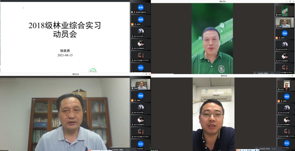 8月15日上午,2018级林学专业暑期综合实习动员大会在线上举行,林学系佃袁勇、梅莉、周靖靖、贾秀红、刘刚、罗杰、张瑜、王奔等8位实习指导老师和2018级林学专业49名学生参加了动员会,院副院长周继荣、副院长王鹏程、林学系主任杜克兵参加会议并对实习提出指导意见。