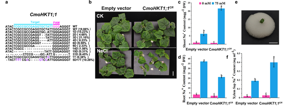 该研究采用农杆菌侵染带有生长点的外植体,首先建立了一种适宜葫芦科作物的发根体系,在南瓜中的效率可以达到84%,该体系同样适用于黄瓜、甜瓜、丝瓜和葫芦等葫芦科作物(图1)。另外,研究者还将发根体系的方法与嫁接方法进行了组合,可以在发根的同时进行嫁接,以实现对砧木的遗传改造(图2)。进一步,该研究在黄瓜/南瓜嫁接复合体中对CmoHKT1;1进行了基因编辑,相关机制研究表明CmoHKT1;1通过限制Na+的长距离运输参与南瓜砧木提高黄瓜接穗的耐盐性(图3)。另外,将南瓜Na+/H+逆向转运蛋白CmoNHX4超表达在黄瓜根系中能显著提高黄瓜的耐盐性(图4)。该发根体系同样适用于在根系细胞中进行亚细胞定位和对根系进行荧光染料染色观察等细胞生物学实验(图4)。以上研究建立了适合葫芦科不同嫁接组合的根系瞬时转化系统,并将其成功应用于瓜类耐盐基因的功能验证,为研究葫芦科作物根系基因功能及砧穗互作提供了一种有效方法。