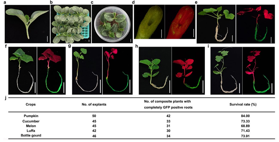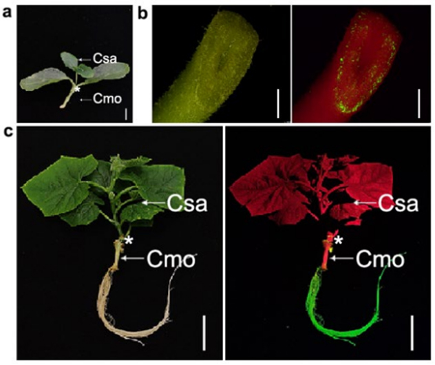 葫芦科作物,包括黄瓜、南瓜、苦瓜、丝瓜、瓠瓜、西瓜、甜瓜等,是重要的瓜果类蔬菜。嫁接是一种古老的农艺手段,历史悠久,沿用至今,仍然在园艺作物生产中广泛使用。南瓜对枯萎病等土传病害的抗性强,是其他葫芦科作物的常用砧木。葫芦科作物由于易嫁接、容易获取木质部和韧皮部液等特点,也是研究植物地上和地下长距离信号的良好模型。以往以葫芦科作物为对象,采用组学手段发现了大量可长距离运输的信号物质,然而由于大多数葫芦科植物缺乏高效的转基因体系,限制了相关基因的功能验证和机制解析。因此,开发适合葫芦科植物的相关基因功能验证体系尤为重要。