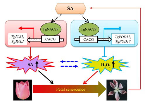 综上所述,该研究揭示了TgNAP调控郁金香花瓣衰老的分子机制:TgNAP通过调节TgICS1、TgPAL1、TgPOD12和TgPOD17的转录,导致SA和H2O2含量积累,从而加速郁金香花瓣的衰老。本研究部分阐述了郁金香花瓣衰老调控的机制,为郁金香花期改良育种和采后保鲜技术研发提供理论基础和关键基因资源。