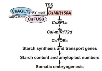 研究发现转录因子CsAGL15和CsFUS3分别结合CsMIR156A启动子并激活其表达。利用短串联靶基因模拟(STTM)技术抑制内源csi-miR156a表达,导致4个靶基因CsSPL2/4/8/14显著上调表达,而体细胞胚发生能力显著减弱(图1);csi-miR172d下调表达,其靶基因CsTOE1.1和CsTOE1.2(抑制淀粉合成的基因)上调表达,而淀粉合成相关基因表达下调,淀粉含量和淀粉体数目降低。综合上述结果,提出如下调控模型(图2):CsAGL15和CsFUS3分别结合CsMIR156A启动子促进其表达,Csi-miR156下调靶基因CsSPLs,靶基因调控Csi-miR172d/CsTOEs影响淀粉合成和转运基因表达,影响愈伤组织淀粉积累从而调控体细胞胚发生。