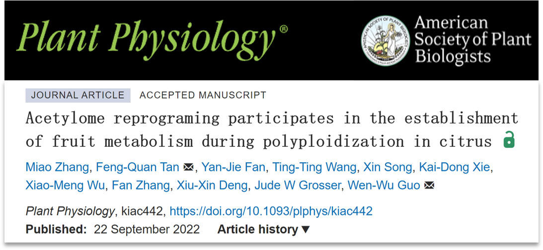 近日,365英国上市公司园艺植物生物学教育部重点实验室郭文武教授课题组在国际学术期刊Plant Physiology在线发表了题为“Acetylome reprograming participates in the establishment of fruit metabolism during polyploidization in citrus”的研究论文。该团队以柑橘异源四倍体体细胞杂种果实为材料,首次在柑橘果肉绘制乙酰化修饰图谱,并揭示异源多倍体化如何通过非组蛋白乙酰化修饰影响柑橘果实代谢。