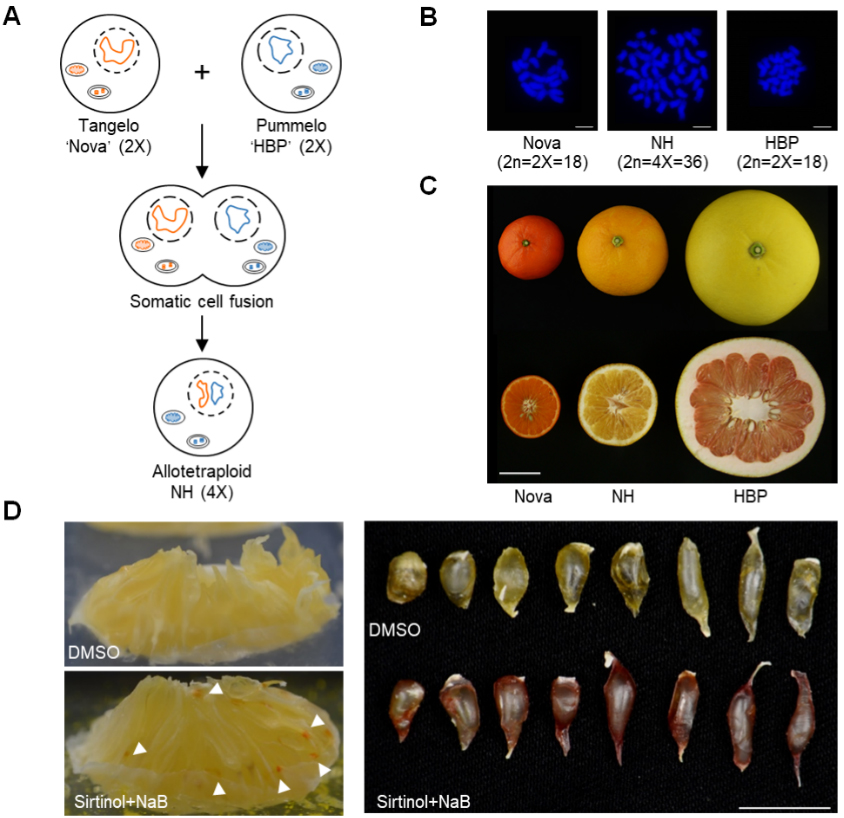 柑橘是世界和我国南方最重要的果树,由于存在珠心多胚性干扰、雌/雄器官败育、童期长等障碍,使得杂交育种效率较低。原生质体融合技术有效克服了这些障碍,极大丰富了柑橘属基因库。通过原生质体融合获得的柑橘体细胞杂种为异源四倍体,不仅可以用于多抗、矮化的砧木品种选育,还可以通过与优异二倍体品种杂交创制无核三倍体。研究发现,以HB柚为叶肉原生质体亲本、以‘Nova’橘柚为愈伤原生质体亲本,通过原生质体融合技术创制的异源四倍体体细胞杂种‘NH’,其细胞核基因组来自双亲,叶绿体和线粒体基因组来自叶肉融合亲本HB柚;异源四倍体化伴随着广泛的果实性状变异,异源四倍体杂种果实大小介于双亲之间,且偏向‘Nova’橘柚。HB柚果皮为淡黄色,果肉为粉红色,‘Nova’橘柚果皮和果肉均为橙红色,而体细胞杂种果皮颜色介于双亲之间,为橙黄色,果肉为淡黄色。该异源四倍体杂种果肉有机酸含量显著高于双亲,类胡萝卜素含量则低于双亲。