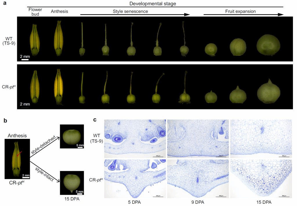 F2:3家系分析及基因编辑敲除PTH/R发现PTR等位型和ptH/R均能使番茄远端形成果尖,PTR为功能缺失型,可调控果尖的形成,而PTH保持果实发育圆滑远端。形态观察发现,花柱是番茄果尖发育所必须的,当截去授粉受精后的花柱时,发育的果实果尖消失。此外,果尖是在花朵授粉受精之后至花柱脱落前,伴随着花柱的衰老过程中确定的,是果实远端向外部发育形成。