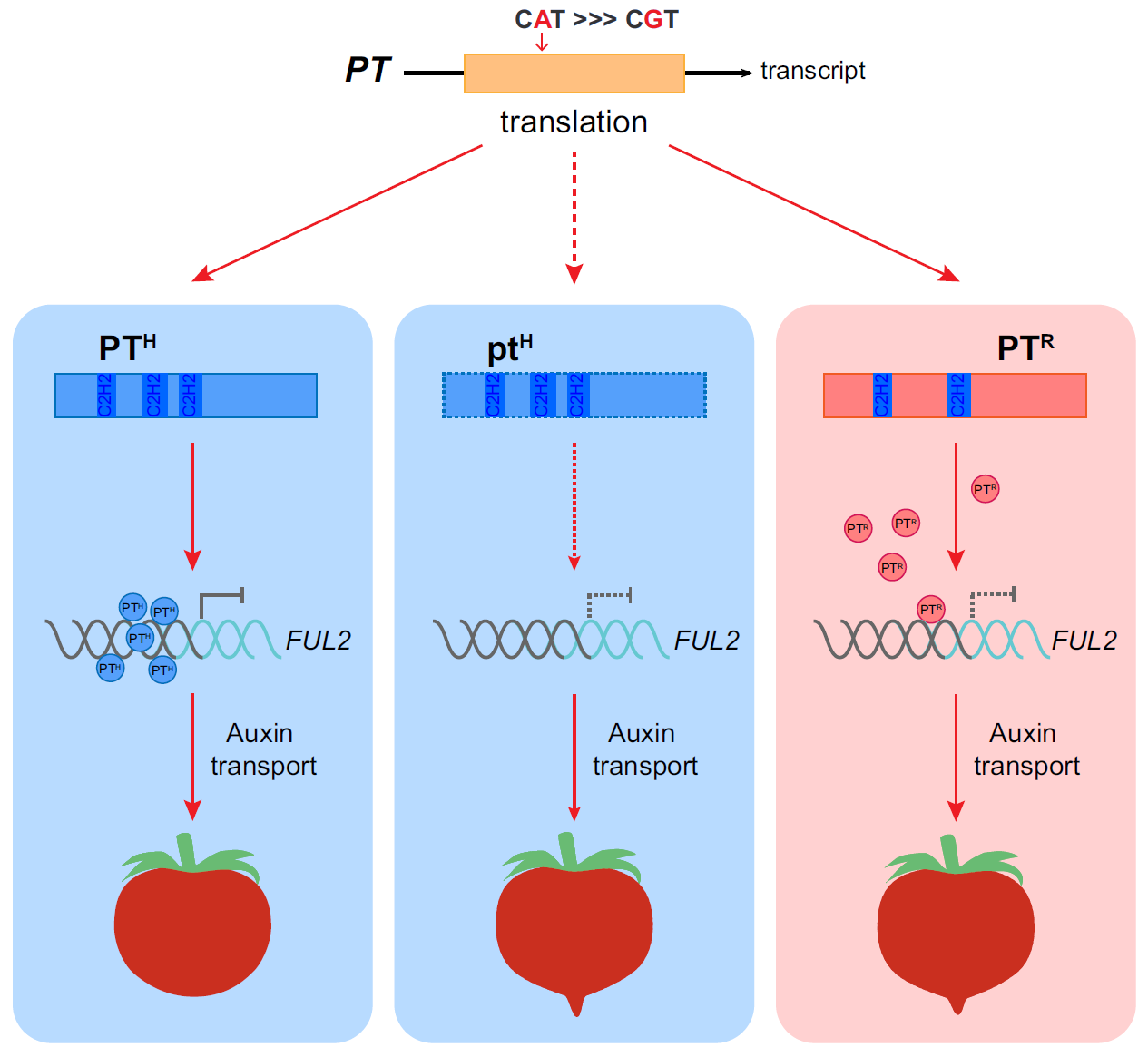 本研究通过对包含311份材料群体的全基因组关联分析以及F2群体的连锁分析鉴定到控制番茄果实远端形态(果尖)基因POINTED TIP(PT),发现Lead SNP位于一个编码C2H2型的锌指蛋白转录因子内部,该SNP的变异导致PT锌指蛋白保守域内保守氨基酸的变异,使得其C2H2保守域的数目由三个变为两个,我们将这两种等位基因分别命名为PTH和PTR。