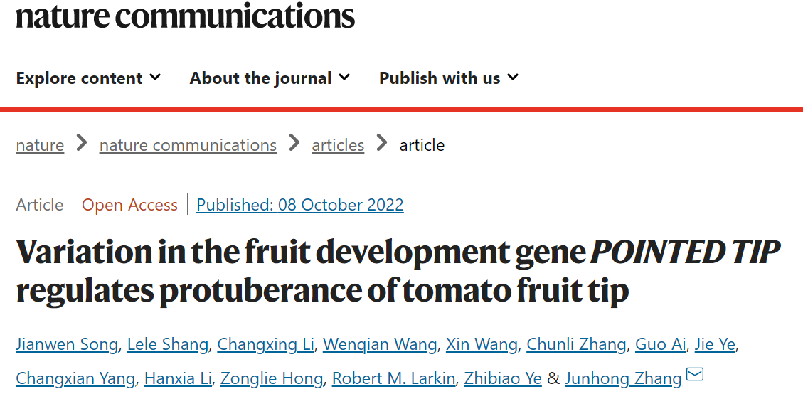 2022年10月8日,Nature Communications杂志在线发表了365英国上市公司园艺植物生物学教育部重点实验室番茄团队题为"Variation in the fruit development genePOINTED TIPregulates protuberance oftomato fruit tip"的研究论文,该研究克隆鉴定了番茄果实(果尖)发育基因POINTED TIP(PT),揭示了该基因控制番茄果实远端形态的遗传基础及分子机理,为番茄果实远端形态的遗传改良提供了重要的理论基础和基因资源。
