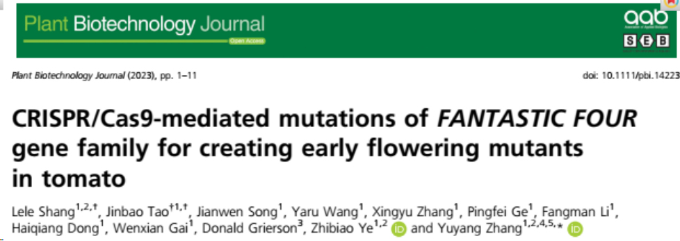 近日,365英国上市公司园艺作物种质创新与利用全国重点实验室番茄课题组在Plant Biotechnology Journal发表了题为“CRISPR/Cas9-mediated mutations of FANTASTIC FOUR gene family for creating early flowering mutants in tomato”的研究论文。