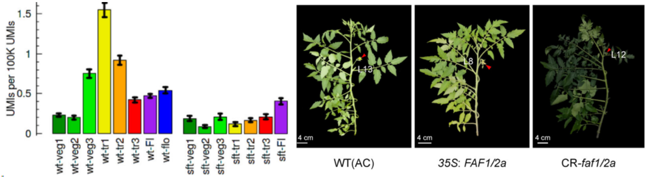 研究人员通过表达分析发现SlFAF家族的5个基因中,SlFAF1/2a表达模式与SAM(shoot apical meristems)发育时期高度相关,超量表达SlFAF1/2a,相对于WT其始花节位缩短了2-5个节位,开花时间提前了20天左右。
