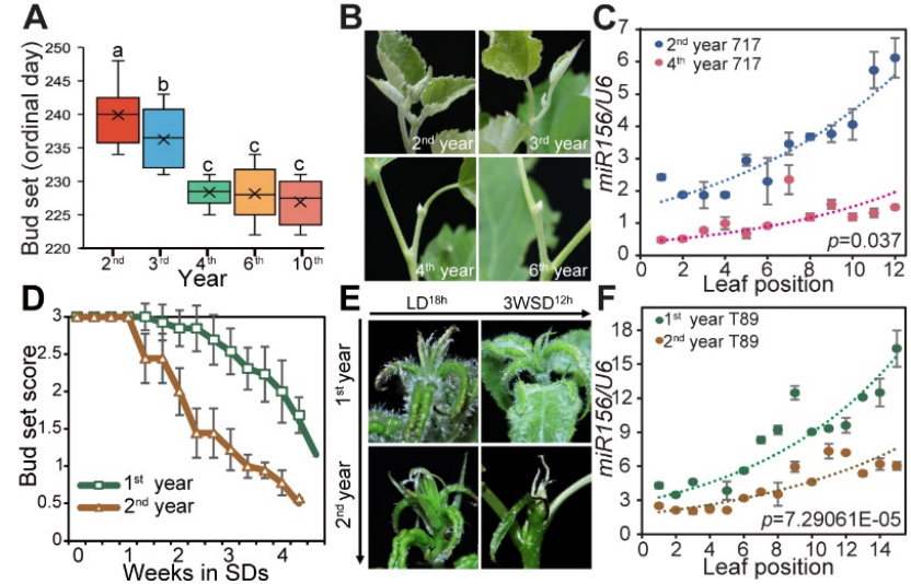 在森林中,幼树为了能在郁闭的环境中生存,演化出与成年树不同步的周年生长策略,具体体现在春天萌芽早、秋天落叶晚,以此获取更多的阳光与能量。但此自然现象是否受遗传调控,以及其背后的遗传机制一直不清楚。该团队经过多年的研究,最终揭示了此现象背后的遗传机与分子基础,揭示了天然林中不同树龄树木重要的气候适应、建立和生存策略的新遗传机制。