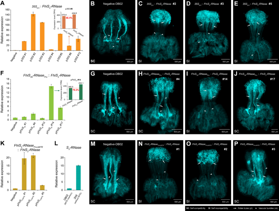 多年生木本植物开展活体基因功能验证耗时长,难度大,但为了确认FhiS2-RNase启动子中的MITE转座子插入是否导致其低水平表达,本研究构建了去除786 bpMITE插入的互补转基因株系(FhiS2-RNaseproΔMITE::FhiS2-RNase-DB02)。在获得的3个稳定开花的转基因株系中,2个株系FhiS2-RNase基因的相对表达量提高了约20倍,苯胺蓝染色结果显示,其花柱可以排斥自我花粉管的生长,表明与对照相比,SI表型已经得到恢复。此外,本研究还发现S2-RNase(PtrS2-RNase)在ZK8 (P. trifoliata,S2S31)花柱组织中的表达量显著高于DB02 (F. hindsii,FhiS2-RNase),其启动子与FhiS2-RNase相比缺少了786 bp的MITE转座子插入。这些结果表明,786 bp的MITE转座子插入抑制了FhiS2-RNase的表达,并导致了山金柑SI的丢失。