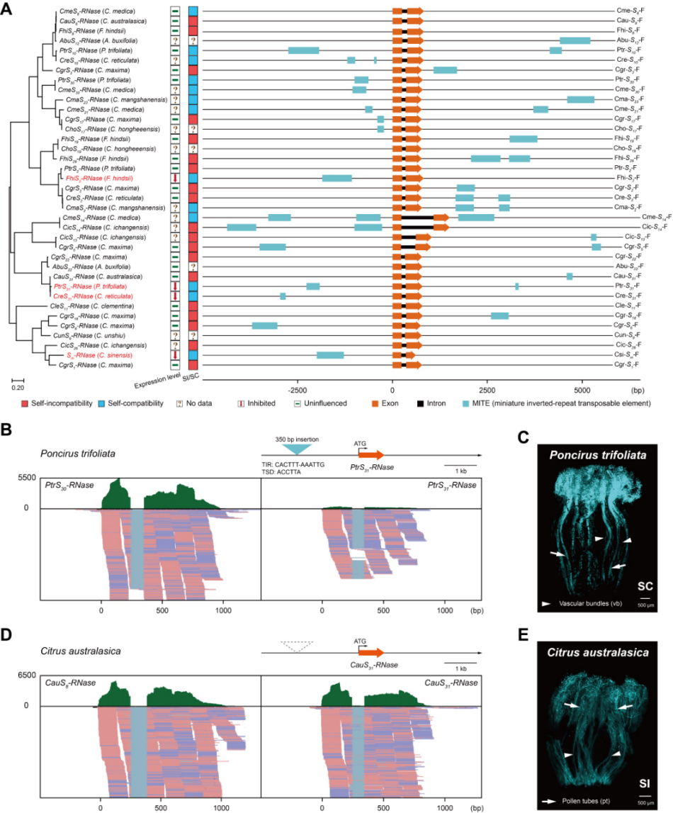 进一步对柑橘家族S位点分析显示,MITE转座子插入事件在柑橘不同属间和种间S-RNase等位基因附近频繁发生,而且特定的MITE转座子插入会影响宿主基因的表达(FhiS2-RNase,PtrS31-RNase及CreS31-RNase),在柑橘SI丢失中起重要作用。此外,在其他常见配子体自交不亲和(gametophytic self-incompatibility)物种中也观察到MITE转座子在S-RNases等位基因附近插入,以上结果表明,基于S-RNases的SI系统中,MITE介导的SI丢失普遍存在。