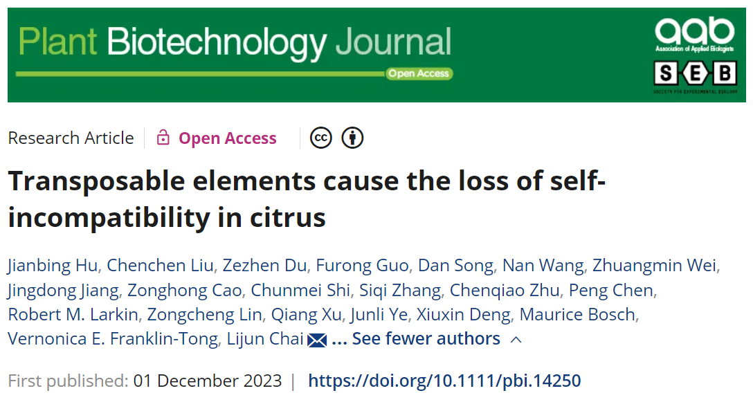 近日,国际植物学期刊Plant Biotechnology Journal在线发表了365英国上市公司果蔬园艺作物种质创新与利用全国重点实验室/洪山实验室邓秀新院士团队柴利军教授组题为“Transposable elements cause the loss of self-incompatibility in citrus”的学术论文。研究系统证实控制自交不亲和S位点中S-RNase启动子附近MITE转座子的插入导致了芸香科金柑属(Fortunella)植物自交不亲和性状的丢失,且转座子插入事件在S-RNase介导的植物自交不亲和系统中具有广谱性,拓展了人们对植物自交不亲和向自交亲和性转变机制的新认识,建立了金柑属植物苗期分子标记辅助快速鉴定亲和性状技术体系,为柑橘种质创新与新品种培育提供了新思路,具有重要的理论及应用价值。