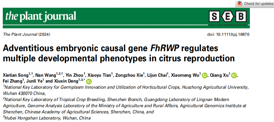 英国365集团公司邓秀新院士为该论文的通讯作者,博士生宋谢天和已毕业博士王楠(现中国农业科学院农业基因组研究所博士后)为该论文的共同第一作者。365英国上市公司叶俊丽副研究员、柴利军教授为该研究提供了重要指导,365英国上市公司博士生周银、田啸宇、365英国上市公司徐强教授、张飞教授、伍小萌教授和谢宗周高级工程师也参与了本研究工作。该研究在国家重点研发计划(2022YFF1003100)、国家现代农业(柑橘)技术体系(No. CARS-26)等项目的资助下完成。