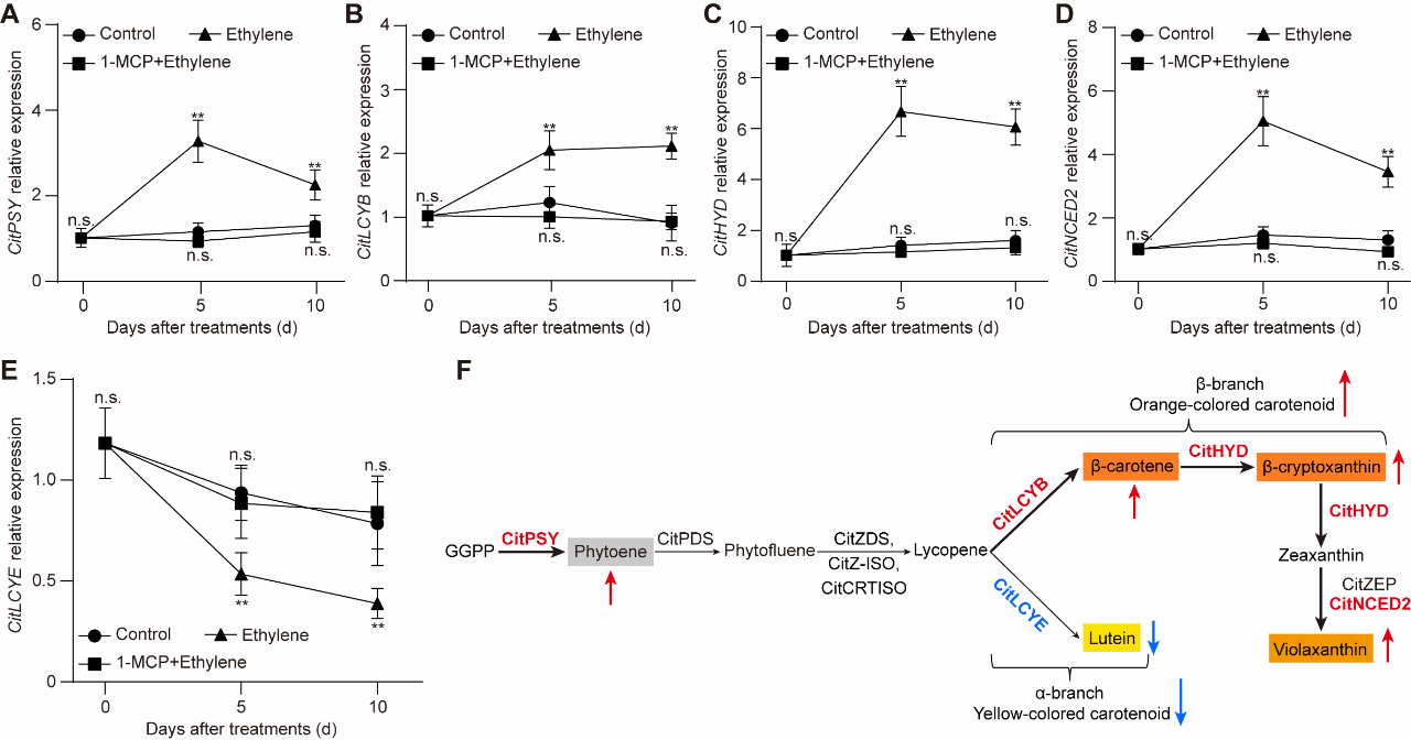 图1. 乙烯对温州蜜柑类胡萝卜素代谢的影响