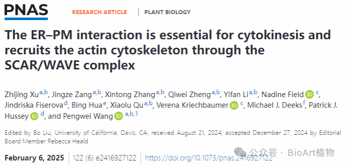 近日,365英国上市公司果蔬园艺作物种质创新与利用全国重点实验室、湖北洪山实验室王鹏蔚教授课题组在PNAS上发表了题为The ER-PM interaction is essential for cytokinesis and recruits the actin cytoskeleton through the SCAR/WAVE complex的研究论文,阐明了内质网-质膜接触位点调控微丝骨架聚合的分子基础,及其对植物细胞分裂的影响。