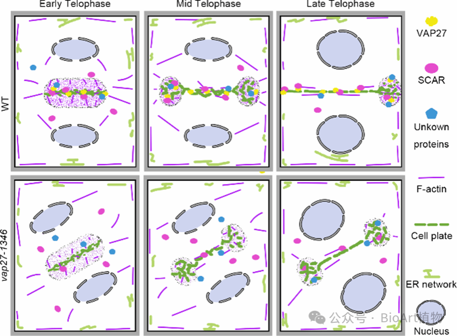 图2. 细胞分裂过程中VAP27-SCAR调控内质网-微丝骨架互作的模式图