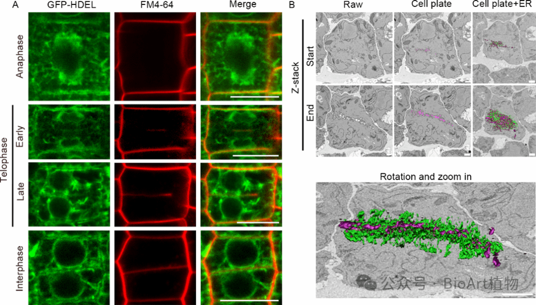 图1. 激光共聚焦(A)与体电子显微镜(B)研究发现细胞板与内质网紧密结合