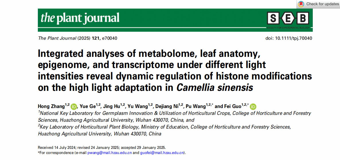 近日,英国365集团公司茶树种质资源与遗传育种团队在The Plant Journal上在线发表了题为“Integrated analyses of metabolome, leaf anatomy, epigenome, and transcriptome under different light intensities reveal dynamic regulation of histone modifications on the high light adaptation in Camellia sinensis”的研究论文。本研究整合代谢组、叶片解剖结构、表观基因组和转录组进行多维度分析,揭示了组蛋白修饰在茶树高光适应中的动态调控作用。